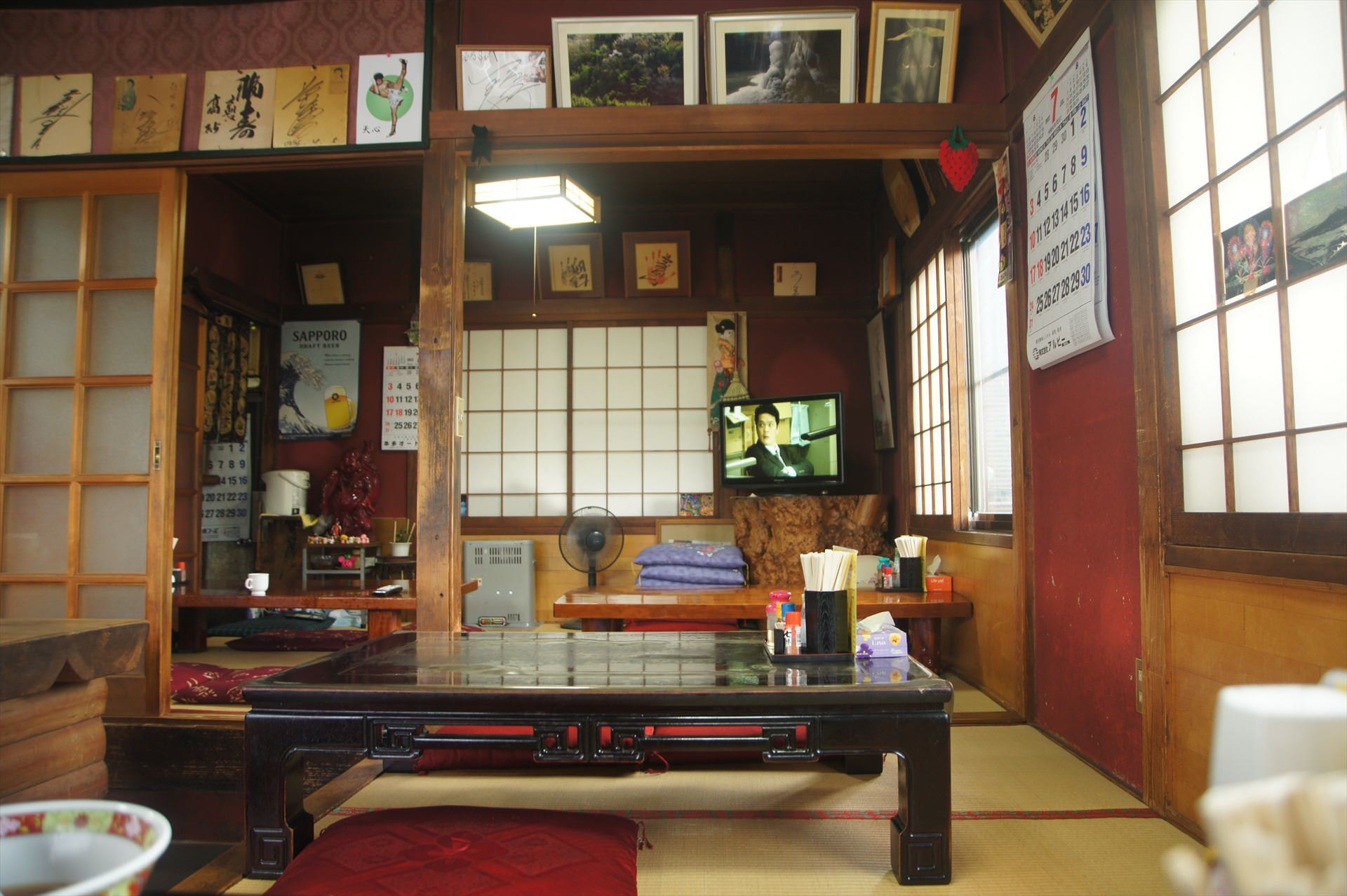 カウンター以外にはテーブル席とお座敷席があり、店内の壁にはレトロなポスターと、風景写真。